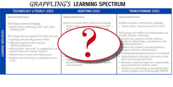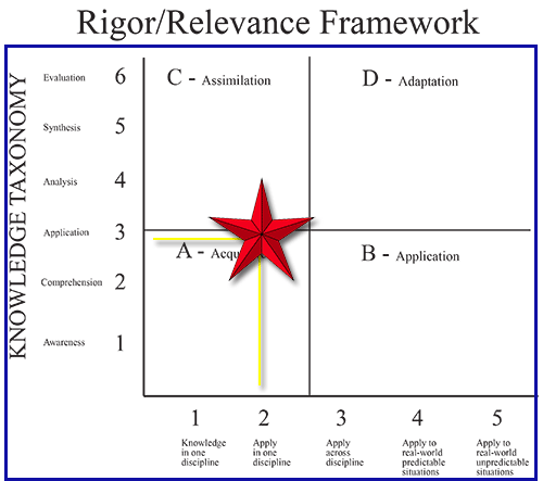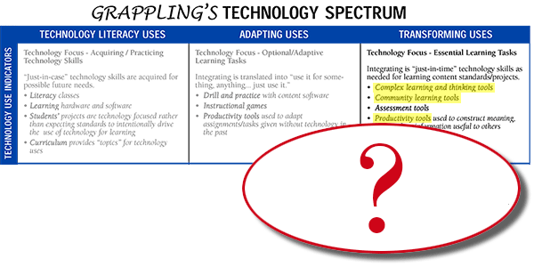 Scenario #10: 4th Grade Teacher My class is currently studying Native American history so I had a guest speaker come in *** Technology Spectrum: None mentioned (apparently someone didn't read the instructions!). *** Learning spectrum: I got nuthin'. *** Rigor/relevance: Again, the description of the assignment is incomplete, so it's difficult to place this scenario on the chart. At least students are able to use their own artistic talents, rather than just looking at examples. More vehement advocates of art might say that the assignment is cross-discipline, as art speaks a language all its own. *** Recommendations: Remember that art is not just visual and two-dimensional. Encourage students to learn words in a native language, and steps to traditional dances. Discover how that art has been integrated into standard American life. Interview, via the web and Skype, members of Native American tribes. << Scenario 9 | Home >>
