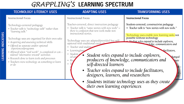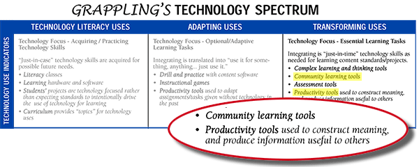 Scenario #5: 5th Grade TeacherAs part of a statewide “art” grant, my students are involved in creating web pages that highlight the history of our city. These web pages (all done by students) include sections relating to the development of the downtown business area as well as our city’s original housing “subdivision.” Students are also linking their web pages to our Chamber of Commerce web page. *** Technology spectrum: In perhaps an unintended use of the term "community learning," these students are delving into the lives of the city in which they live. I'm hoping that the students are using technology to connect with others, as well as to design their art. Once the web pages are linked to the Chamber of Commerce web site, the assignment reaches the Transforming Uses category in its ability to produce and share information of interest to the entire community. *** Learning spectrum: Although it's obviously not possible to design a web page without a Transforming Use of technology, that's not why I place this scenario in that category. Instead, I put it there because, based on the few sentences of the scenario, I imagine the students have free creative rein on their web projects. *** Rigor/relevance: Allowing students to develop their own art via technology -- synthesis -- moves this scenario well into Quadrant D. When students begin to receive non-educator feedback on their web pages (from visitors to the Chamber website) they'll get a dose of unpredicability as well! *** Recommendation: Move this assignment deeper into Quadrant D of the rigor/relevance chart by tracking the changes between the historical and current city situations, and evaluate the quality and usefulness of the changes. In other words, is there really such a thing as "the good old days"? << Scenario 4 | Home | Scenario 6 >> |